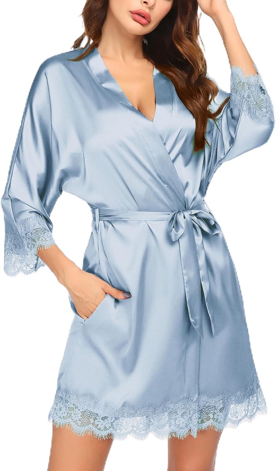 - CHIC AND ALWAYS IN STYLE: Short Satin Kimono Robes feature 2 pockets, fabric strings inside to hold the robe together, and a removable belt to fasten it, lace trim at the sleeves and lower hem.