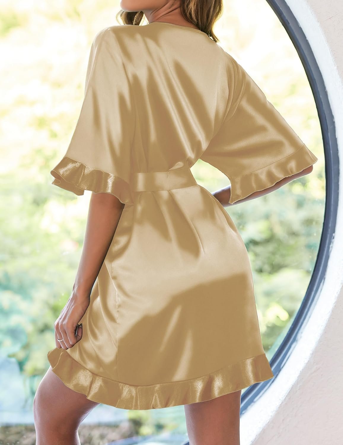 - ❀Short Ruffled Silk Robe: The short satin robe features above knee length,ruffled sleeve and ruffled bottom hem, 3/4 sleeve, oblique V-neck, inside strings, belted,short kimono silk robes.